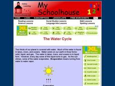 For this water cycle worksheet, learners learn about evaporation, condensation and precipitation by reading a text. Students then answer 12 multiple choice questions. This is an online interactive worksheet.