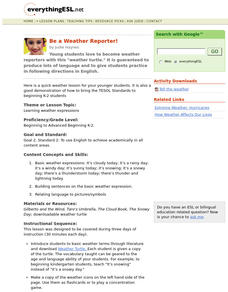 Students make a weather turtle puppet and use it to respond to weather-related questions. They manipulate the turtle to show basic weather vocabulary such as: sunny, windy, rainy, snowy, etc.