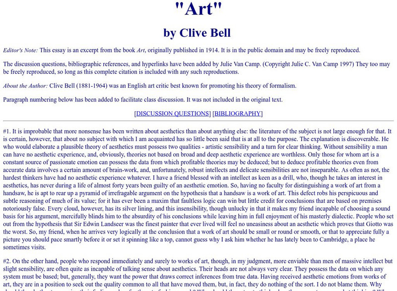 The California State University provides an essay from the book "Art," originally published in 1914. There are discussion questions and links added by Julie C. Van Camp. The Formalist concepts of art by Clive Bell is thouroughly discussed.