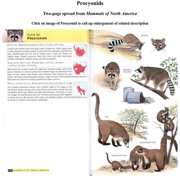 From the pages of "Mammals of North America," a field guide published by Princeton University Press, this website offers general descriptions of several procyonids, including ringtails, northern raccoons, and white-nosed coati. Detailed...