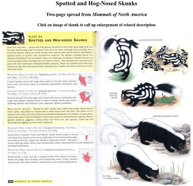 From the pages of "Mammals of North America," a field guide published by Princeton University Press, this website offers general descriptions of both spotted and hog-nosed skunks. Detailed pictures and maps of habitat range are also...