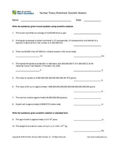 In this scientific notation worksheet, learners solve a total of 10 problems, writing numbers given in problems using scientific notation, then numbers given in scientific notation in standard form.