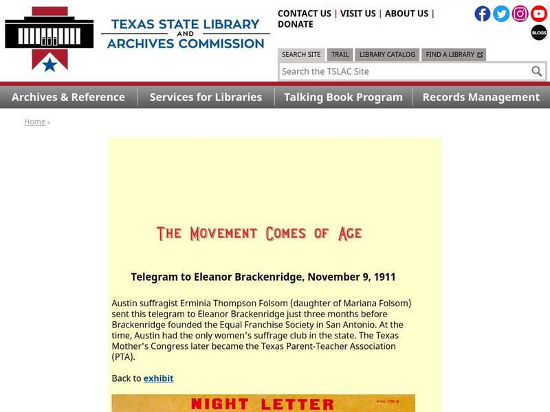 Texas State Library and Archives Commission: The Movement Comes of Age: Telegram to Eleanor Brackenridge, 1911