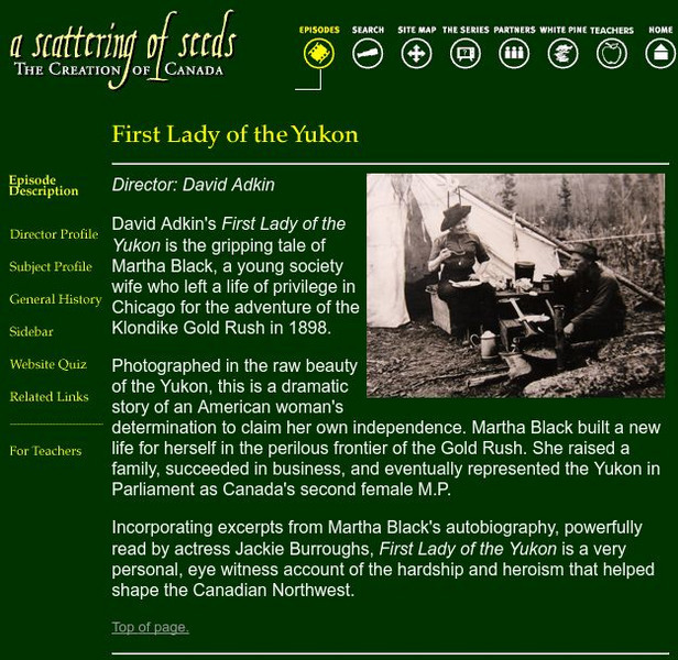 Martha Black was an adventurous woman who left a comfortable life in Chicago to live in the Yukon during the Gold Rush. She became the second female Member of Parliament in Canada. This site describes the making of a television...