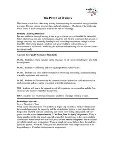 Measure the amount of energy in a peanut by igniting a chemical reaction. Classes use a laboratory setup to burn a peanut and measure the amount of heat it releases through a temperature analysis. They calculate the number of Joules of...