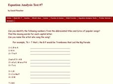 In this equations analysis worksheet, students identify the numbers listed from the abbreviated titles and lyrics of popular songs. Then, they find the missing words for each capital letter and name the artist who sang the song.