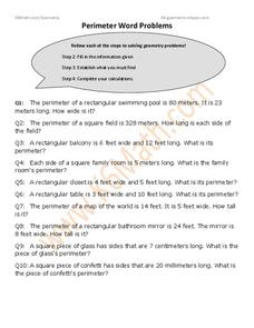 In this perimeter worksheet, learners complete a set of 10 short word problems that define certain measurements and ask for perimeter. A reference web site is given for additional activities.