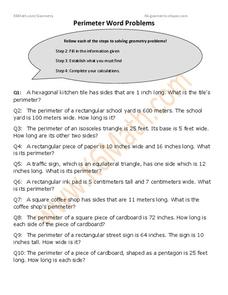 In this perimeter worksheet, students complete a set of 10 word problems, writing given information, determining that they are looking for and calculating. A reference web site is given for additional activities.