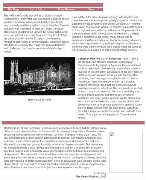 Interesting general discussion of Canadian art and artists between 1920-1950 that was a new generation of painters than before the First World War. Gives biographical information on a variety of different painters with examples of their...