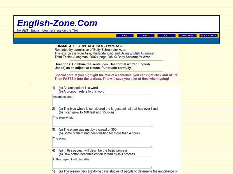 A ten-question exercise with each question consisting of a pair of clauses. Students are asked to combine the two clauses into one complete sentence by using the second clause to create an adjective clause. Students can check their...