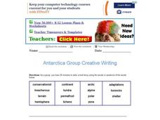 In this creative writing worksheet, students write a brief story about Antarctica, using a list of given words or variations of the words.