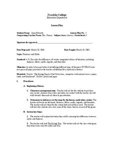 Fourth graders examine different types of literature, specifically myths and fantasy. They listen to "The Giving Tree", identify in which genre of literature it belongs, and view several myths on a website. At end of lesson, 4th...