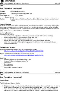 Young writers use nouns, verbs, and adjectives to describe details in two paintings. One depicts a sunny landscape, and the other shows a cloudier view. They write a narrative inspired by the paintings, paying attention to transitional...