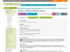 Transfer information from an outline into a well-developed research report. Using an already-written outline, model how to write an introductory paragraph and a body paragraph. Work through the conclusion as a class before allowing time...