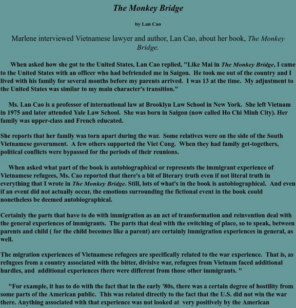 The writer interviewed Lan Cao about her book. She includes some biographical information in the article as well as discussion of the book.