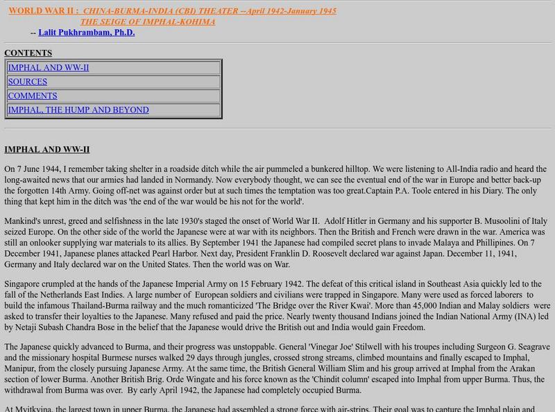 This site discusses the CBI theater in World War II, including the Siege of Imphal-Kohima.