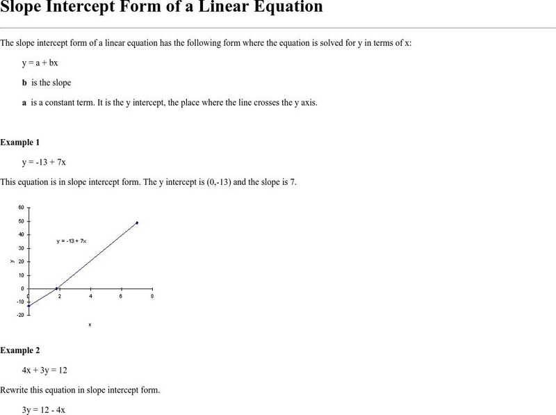 This site from the Columbia University in the City of New York provides brief information on the slope-intercept form, and then has four helpful examples on the subject. Each example goes through the steps involved and arrives at a...