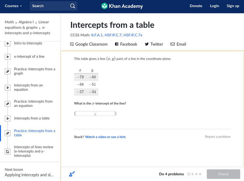 Khan Academy: Intercepts From a Table