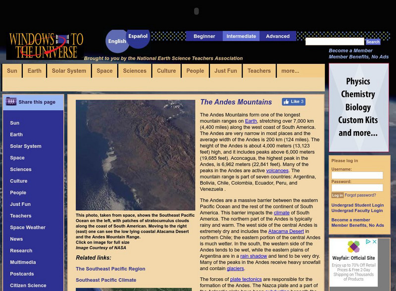 Satellite photography and brief outline information describe the Andes mountains and provide links to specific features within the landscape - Atacama desert, or evidence of volcanic activity for example.