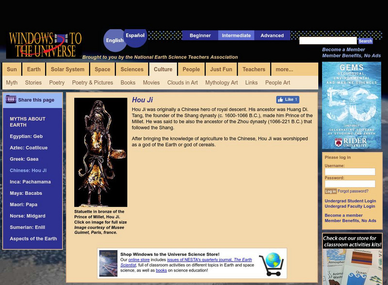 Find out more about Hou Ji by using this website. "After bringing the knowledge of agriculture to the Chinese, Hou Ji was worshiped as a god of the Earth or god of cereals."