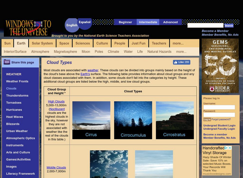 Windows to the Universe provides a table with information about each cloud group, base height of each of the cloud groups, and links to information on the individual cloud types associated each group.