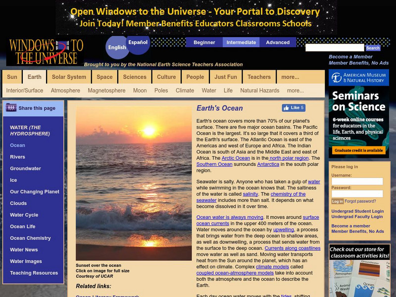 Windows to the Universe provides a general overview of the importance of the oceans and seas to the Earth. Content includes information on how the oceans impact Earth's weather and contribute to the water cycle.
