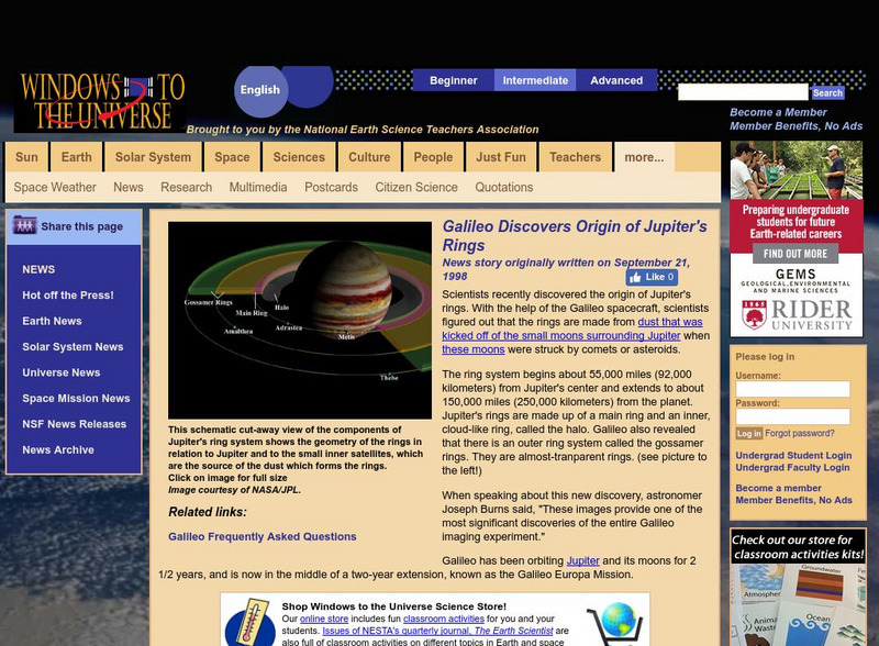 Windows to the Universe of the University of Michigan gives a brief introduction to Jupiter's rings. The information can be accessed in a beginner, intermediate, or an advanced setting.