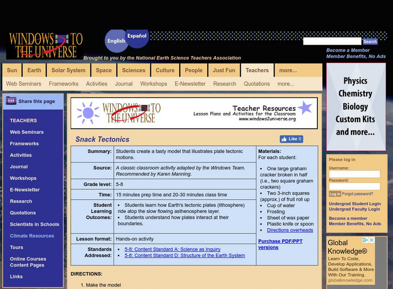 Students create a model using food that simulates the layering and movement of tectonic plates. Overheads are provided that demonstrate different ways to position the graham crackers, frosting, and fruit roll-ups to emulate how the...