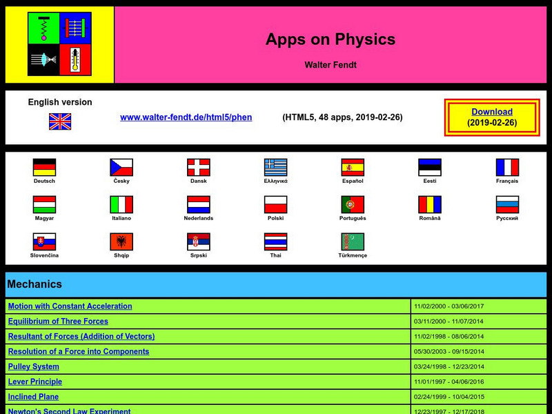 This collection by Walter Fendt (who also offers many applets on mathematics and astronomy) is large and comprehensive. Everything from classical mechanics to the theory of relativity and nuclear physics is covered. Numerous interactive...