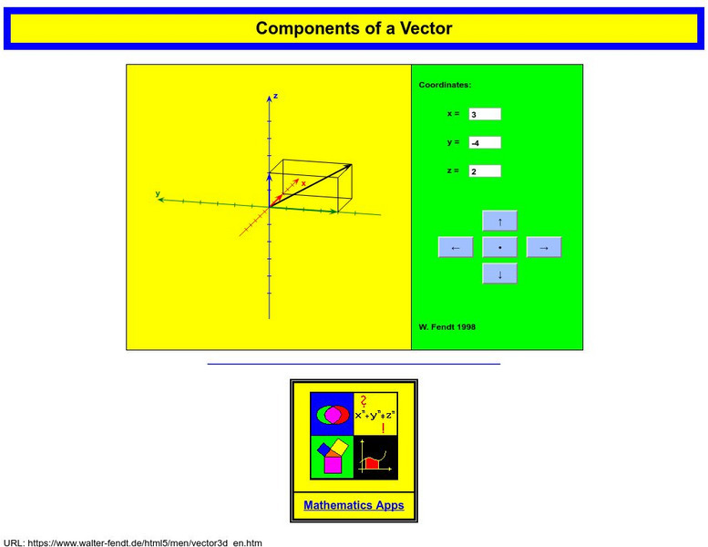 A short interactive activity to help you visualize the components of a vector. You will be able to change the values of x, y, z and the rotation.