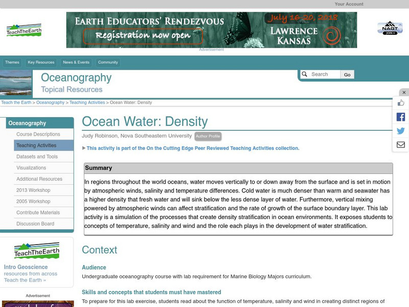 For this lesson students will learn about the stratification of the ocean by using a simulation to show the different densities. The simulation explores how temperature, salinity, and wind affect the development of water stratification.