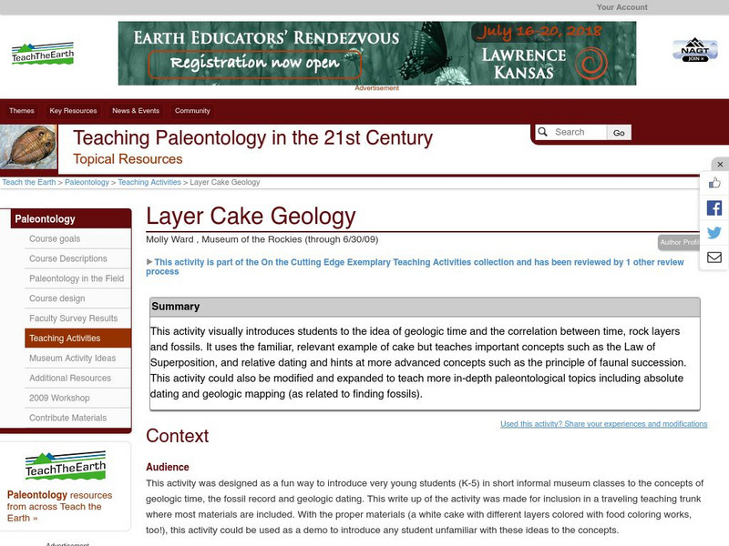 Using a cake analogy, this activity teaches concepts such as: geologic time, rock layers, fossils, Law of Superposition, and relative dating. Activity can be modified to grade level and appropriate content for students,