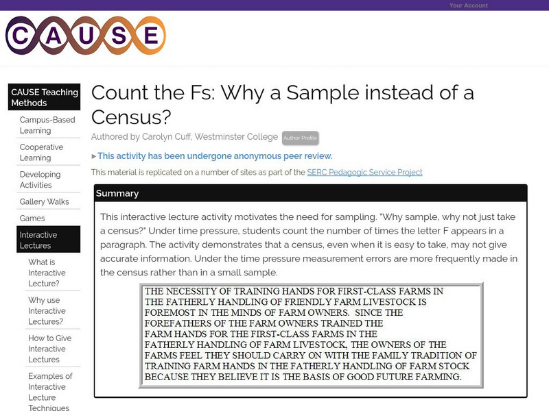 In this interactive lecture activity, students count the number of times the letter F appears in a paragraph. The activity demonstrates that a census may not always give accurate information, and that sample counting can be a more...