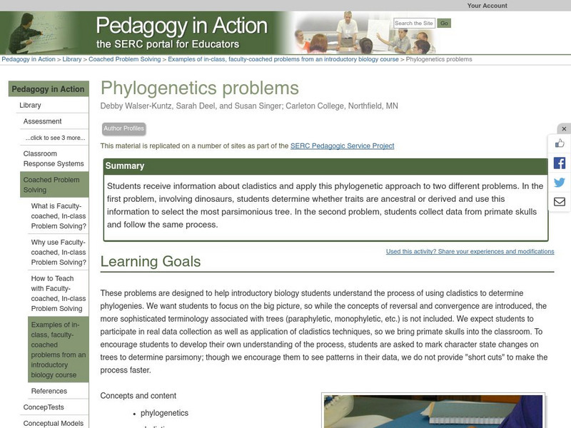 A lesson plan where students solve problems by using cladistics to determine phylogenies. Problems require that students determine which characteristics are ancestral or derived by looking at both dinosaurs' remains and primate skulls....