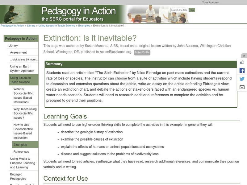 Students read the article "The Sixth Extinction" by Niles Eldredge on past mass extinctions and the current rate of loss of species. There is a choice of student activities which includes having students respond to discussion and...