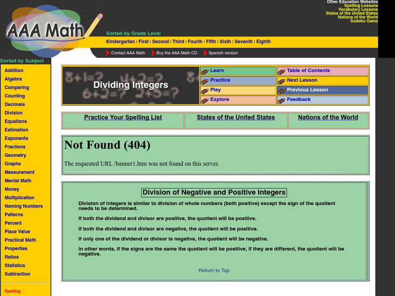 AAA Math provides a descriptive summary of the division of integers and interactive questions with positive and negative integers.