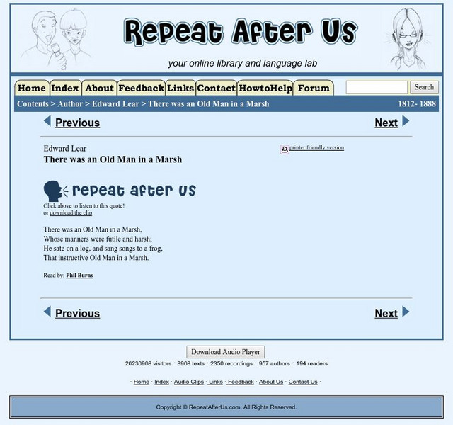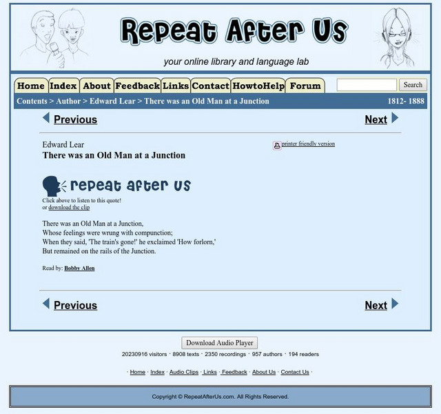 [To hear audio, use Chrome browser.] This site offers the text and audio of the poem "There Was an Old Man at a Junction" by Edward Lear.