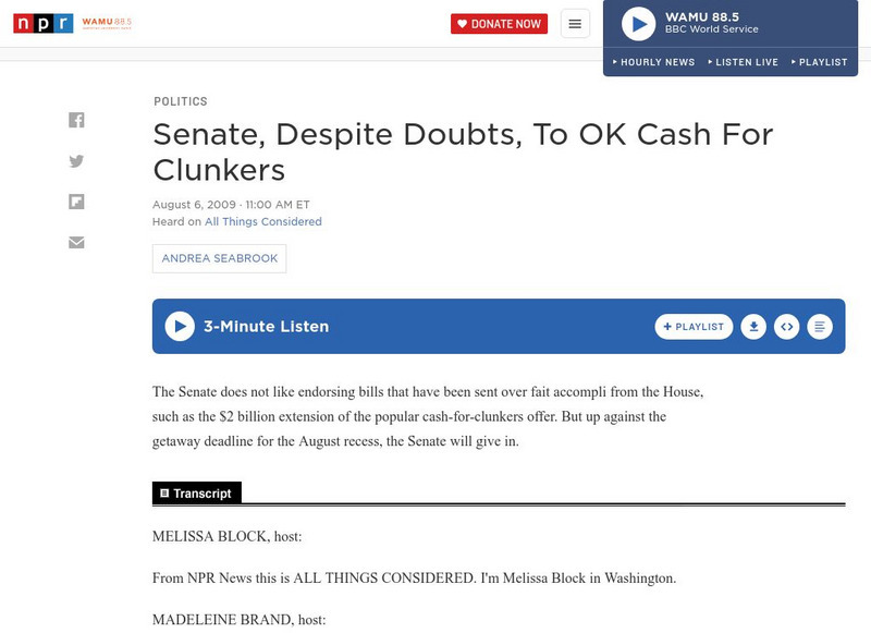 In this August 6 ,2009 story from National Public Radio, Andrea Seabrook reports on the Senate debate to add additional money to the Cash For Clunkers program. Provided in both print and audio format with links to other NPR related...