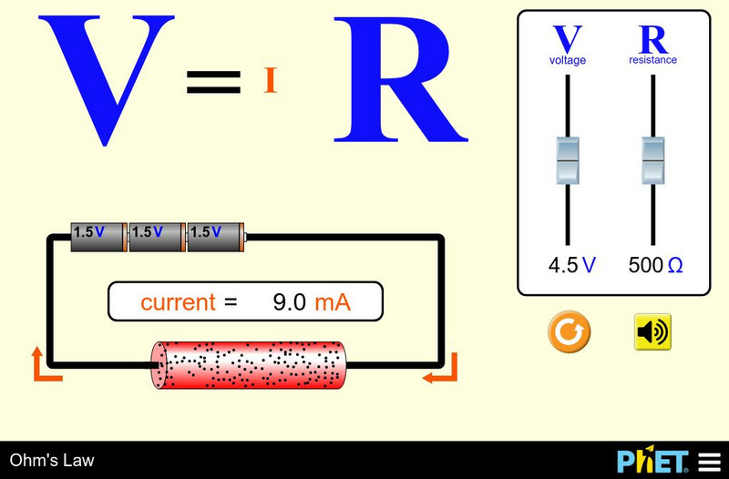Manipulate the voltage and resistance for a simple circuit to see how these affect the amount of current. The symbols in the Ohm's Law equation grow bigger and smaller to emphasize the changes.