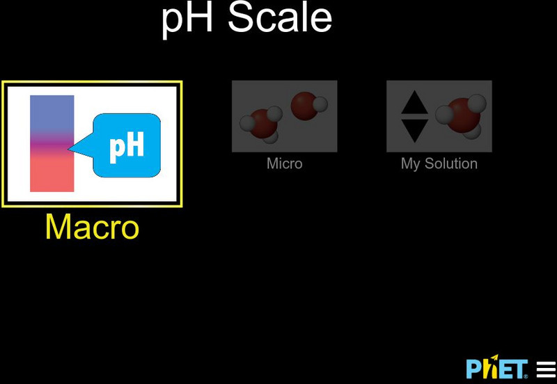 Review examples of macro and micro pH scales of a variety of substances available in a drop down menu. Create a solution to measure.