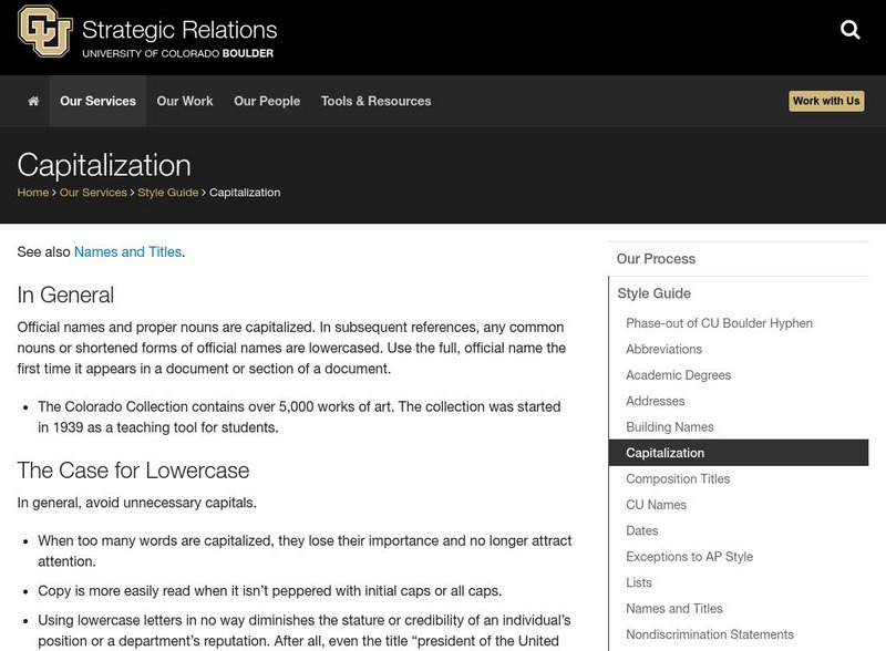 A comprehensive guide to editorial style for print and electronic media. Students and teachers can gain a better grasp of the rules of capitalization from this resource.