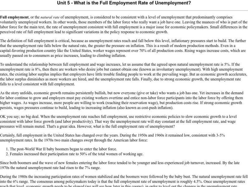 Unit 5 of a macroeconomics course. Looks at the meaning of 'full employment' and how this relates to the rate of unemployment.