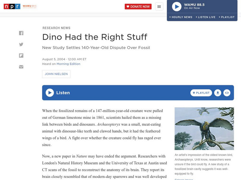 NPR reports on new research about the oldest known bird, Archaeopteryx. A new study of a fossilized brain cavity suggests it was well-equipped to fly.
