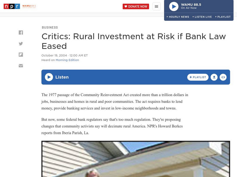 NPR looks at rural America since the passage of the 1977 Community Reinvestment Act and the possible ramifications if this law is eased. More source websites are listed on the side.