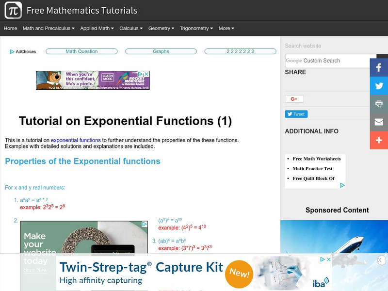 The tutorial explores the properties of exponential functions. The activity includes examples with detailed solutions.