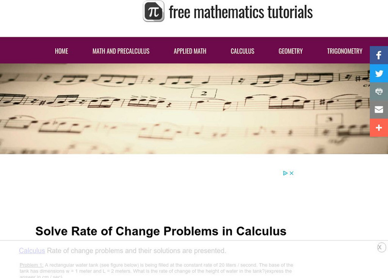 The resource consists of examples with detailed solutions that examine rate of change problems. Practice exercises are included.
