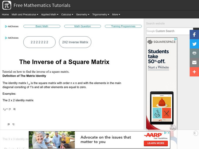 Learners explore the discrete mathematics topic of matrices. The tutorial demonstrates how to calculate the inverse of a square matrix. The activity includes examples with 2 by 2 and 3 by 3 matrices.