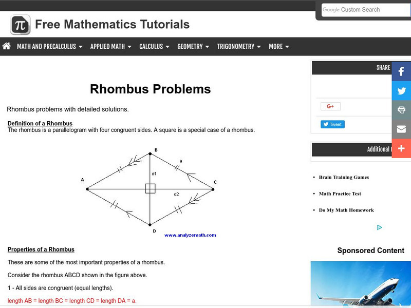 The geometry tutorial explores the definition, area, and properties of a rhombus. The activity has several examples with detailed solutions.