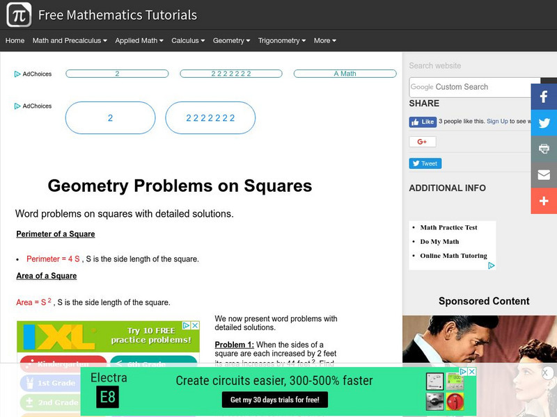 The geometry tutorial investigates word problems on squares with detailed solutions. Topics included are perimeter and area of a square.