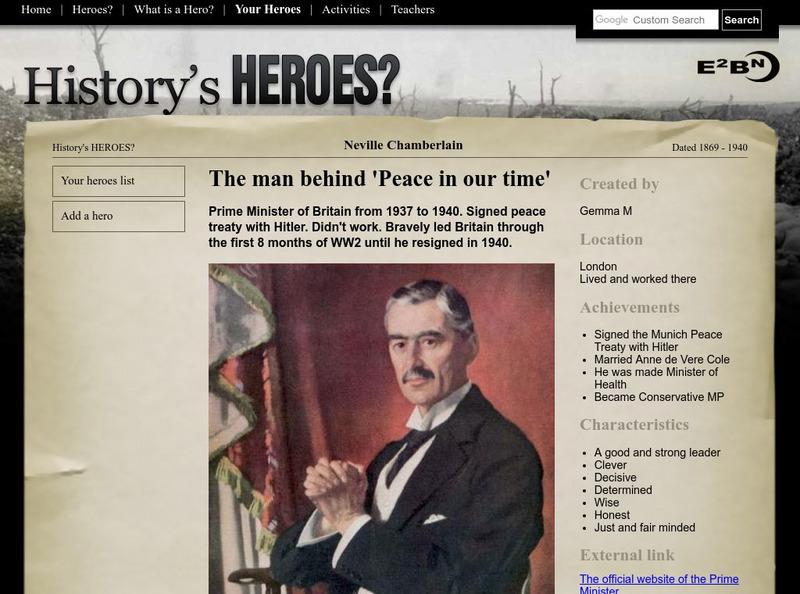 This website explores the lives of people who made their mark on history. Features illustrated story on Neville Chamberlain, Prime Minister of Britain from 1937 to 1940. Find out who he was, what he did, his achievements, and his legacy.